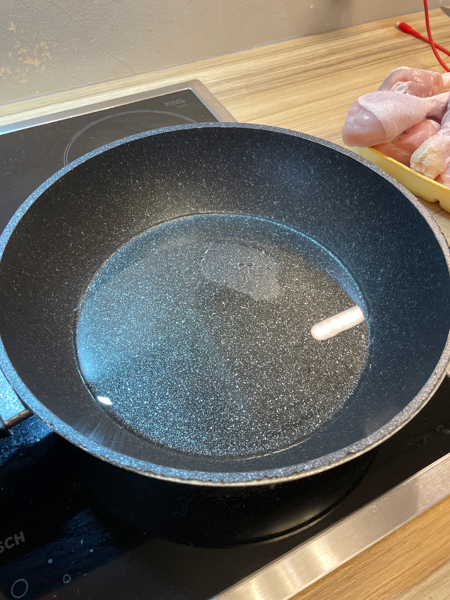 Это волшебное блюдо грузинской кухни, рецепт я взял с ресторана в Батуми, НО! поскольку мы готовим из продуктов из ближайшего магазина, курица целая превратилась в голень, свежие травы в набор "Кавказских трав", но в общем и целом, само блюдо получается также волшебно. первым делом наливаем масло, 2 столовые ложки на сковородку (можно и 3, здесь только на пользу) выкладываем голени, узкой стороной в середину. Солим 1/4 чайной ложки (из полной дозировки соли на блюдо в 1 чайную ложку) и накрываем тарелкой. Сверху тарелки, ставим пресс. У меня кастрюля с водой 2 литра, вполне хватает. УМЕНЬШАЕМ ОГОНЬ НА ЧУТЬ ЧУТЬ!!! Должно скворчать под прессом, курица в первое время даст много воды, чтоб она под прессом не варилась а жарилась, огонь должен быть сильным. брызг не бойтесь, высокие борта кастрюли и тарелка все их сгладят. Таймер на 15 минут и забываем. через 15 минут, снимаем пресс и тарелку, переворачиваем. И снова пресс Еще на 15 минут забыли через отведение время снимаем курицу со с