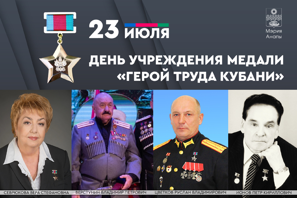 Высшей наградой Краснодарского края отмечено несколько анапчан. Медалью награждена Заслуженный врач РФ, лауреат премии Правительства РФ в области науки и техники, Почётный гражданин Анапы, руководитель Анапской региональной курортной ассоциации, гендиректор санаторно-курортного комплекса «ДиЛуч» Вера Стефановна Севрюкова.