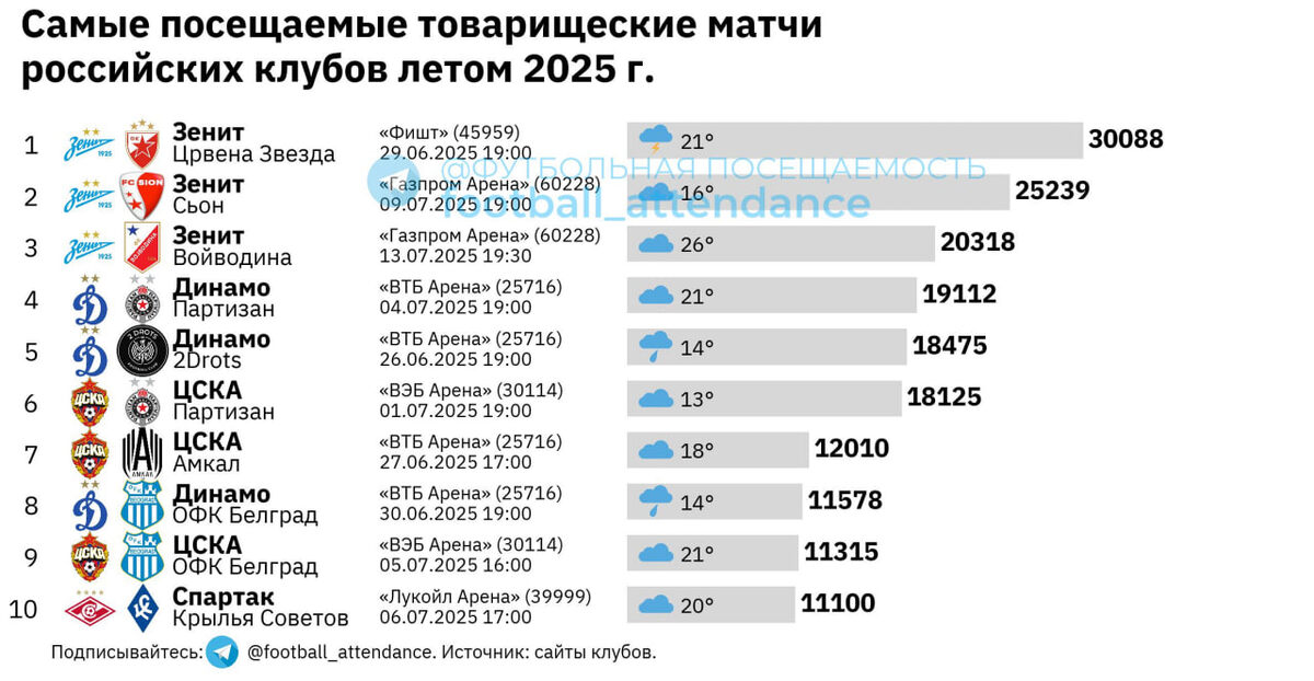 Обычно в контексте межсезонья и товарищеских/контрольных матчей о теме посещаемости говорить не приходится. Чаще игры проходят при «закрытых дверях», и заморчиваться с организацией полноценного прохода зрителей и обеспечением безопасности клубы не хотят. Однако есть и исключения из правил. Пока что собирать аудиторию и шоу научились менее половины команд РПЛ. В топ-10 попали домашние встречи четырёх клубов. По три игры «Зенита», ЦСКА и «Динамо» и одна – «Спартака». Были зрители на товарках «Краснодара» (на стадионе академии) и «Локо» (3-таймовый матч с «Динамо» на «РЖД Арене»). Основными «турнирами» для болельщиков стали Суперсерия «Зенита» и Братский кубок «Динамо» и ЦСКА. Эту и другую интересную инфографику о посещаемости сморите в канале «Футбольная посещаемость». СБГ удалось собрать 30088 человек в Сочи. Это примерно половина от всей суммарной за 17 матчей посещаемости местного «Сочи» в прошедшем сезоне Первой лиги (69787). Всего у «Зенита» три классно организованных матча (на «Вой