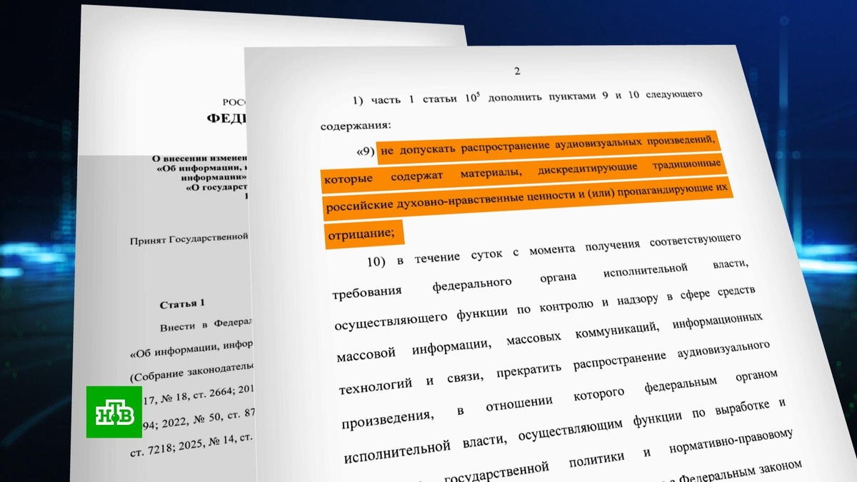 [ Смотреть видео на сайте НТВ ] В окончательном варианте закон смягчили: исчезло требование к онлайн-кинотеатрам показывать только те фильмы и сериалы, на которые есть прокатные удостоверения Минкультуры. Госдума приняла в третьем, окончательном, чтении закон, который дает Министерству культуры право отказать в выдаче прокатного удостоверения фильму, который дискредитирует традиционные российские духовно-нравственные ценности. Закон вступит в силу с 1 марта 2026 года. При этом из закона исчезло требование к онлайн-кинотеатрам показывать только те фильмы и сериалы, на которые есть прокатные удостоверения от Минкультуры — оно было в первом чтении. Но от них требуется в течение суток с момента получения требований от Роскомнадзора прекратить распространение фильмов, которым Минкультуры отказало в выдаче прокатного удостоверения. Кроме того, владельцы сервисов должны будут заниматься мониторингом своих платформ, чтобы выявлять запретные произведения и незамедлительно ограничивать доступ. [