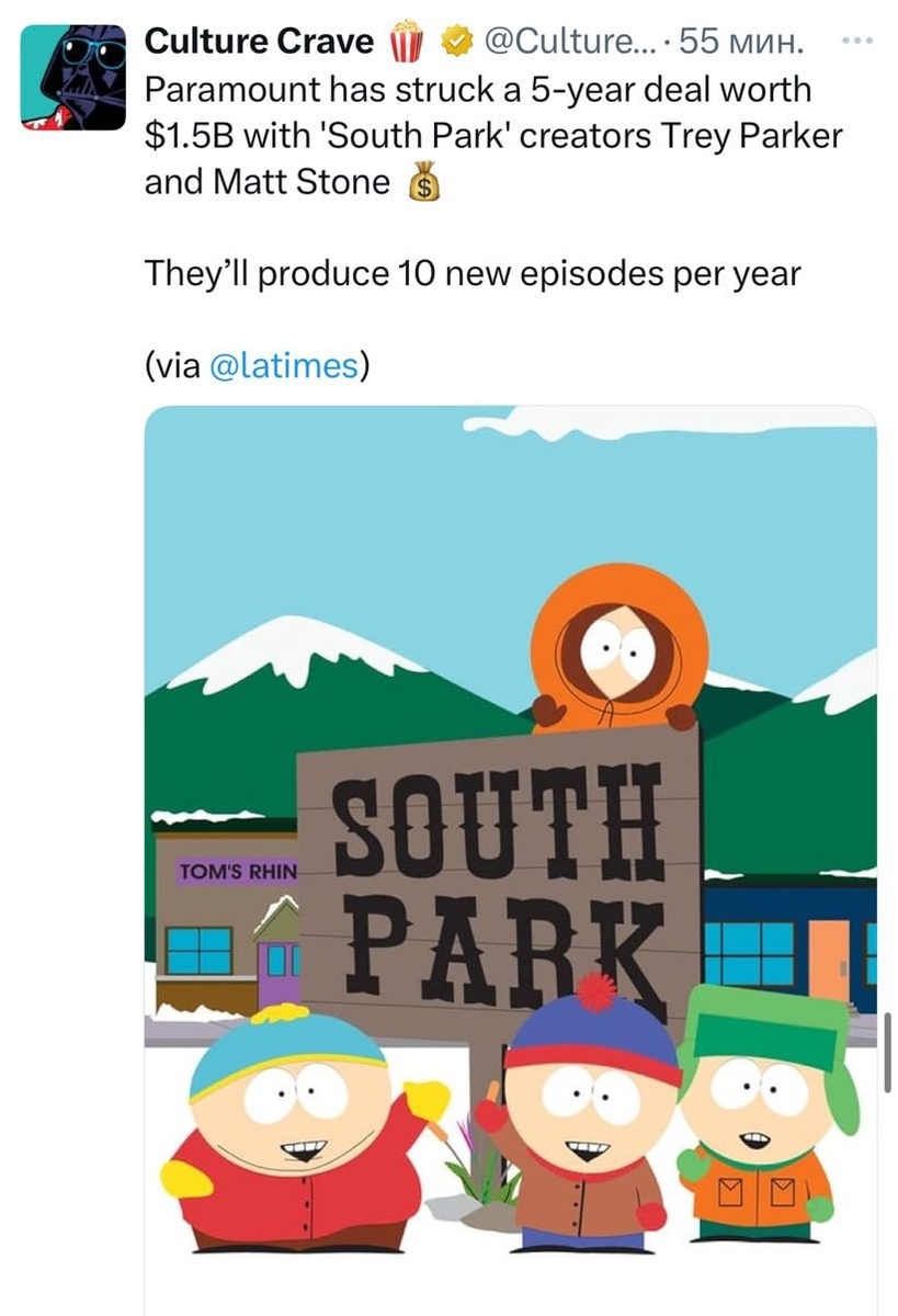 «Южный парк» продлили ещё на 5 лет в Paramount выделили на это ещё 1,5 млрд долларов. Авторы мультсериала подписали новый контракт с Paramount: теперь они будут выпускать по 10 свежих серий в год до 2030-го. CtrlAltDelights- подписаться