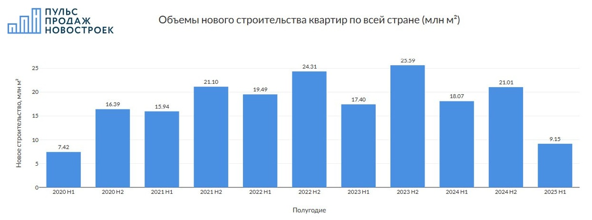 2025 Н1: 9,15 млн м² (-49,4% к аналогичному периоду 2024)