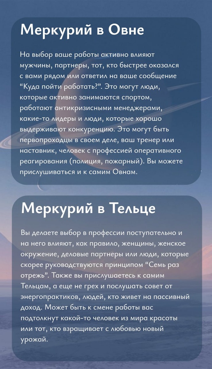 🌟 Кто влияет на выбор вашей работы 🌟 Расскажет Меркурий в натальной карте. В астрологии эта планета отвечает за рутинные процессы и наемный труд, то, чем мы занимаемся в работе каждый день. Его знак расскажет о персонах, которые могли повлиять либо на ваш выбор профессии, либо на выбор текущей работы. Эту информацию полезно знать, когда вы стоите перед выбором в карьерном треке, меняете работу или ищите новое место. Инструкция: 🌟Строим свою натальную карту на сайт Sotis (Гороскоп 🌟 Создать новый 🌟 Одинарная карта. Вводим свою дату, время* и место рождения) * если время не известно, то ставьте 12:00 и добавляйте галочку у "Космограмма", пока этого хватит 🌟Ищем знак Меркурий, он выглядит так 🌟 🌟Смотрим в каком знаке он находится. Можно просто тыкнуть на него, раскроется подсказка. 🌟 Ищем знак Меркурия в карточке к посту 🌟Читаем карточку 🌟 А если вам нужна помощь – пишите свои данные (дата, время и место рождения) в комментариях. Я подскажу, что к чему с вашим Меркур