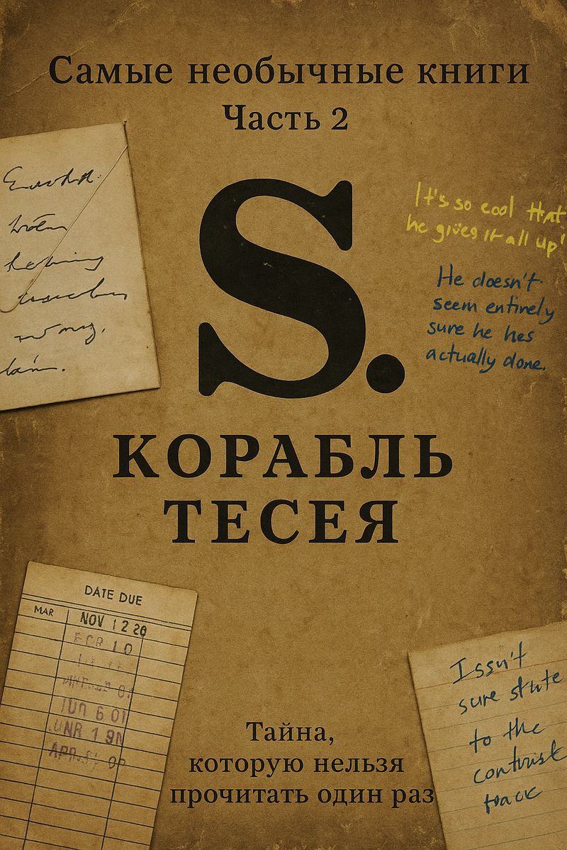 📚 Самые необычные книги. Часть 2 S. / Корабль Тесея — тайны самой загадочной книги XXI века (авторы: Дж. Дж. Абрамс и Даг Дорст / J.J. Abrams & Doug Dorst) Мы продолжаем наше путешествие по самым странным, загадочным и нестандартным книгам в истории. Сегодня перед нами — настоящий шедевр литературного квеста. Книга, в которой за каждой строчкой скрыт шифр, а сам читатель становится участником расследования. Речь пойдёт о произведении "S." / "Корабль Тесея", уникальный литературный эксперимент от режиссёра Дж. Дж. Абрамса (J.J. Abrams) и писателя Дага Дорста (Doug Dorst). Это не просто роман. Это история внутри истории — со шпионажем, зашифрованными посланиями, тайной личностью и перепиской на полях. Это тот самый Дж. Дж. Абрамсом (J.J. Abrams),режиссёр, снявший «Армагеддон», «Звёздный путь» и «Пробуждение силы». А воплотил его идею в слова писатель Даг Дорст (Doug Dorst), превратив её в настоящий многослойный роман-головоломку. 📘 Что это за книга? На суперобложке — лишь од