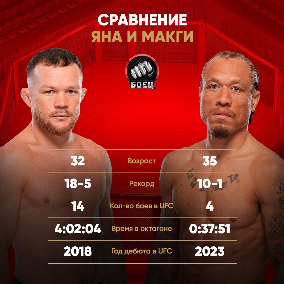 Ян 🆚 Макги Со-главное событие предстоящего турнира UFC в Абу-Даби 👊 Бывший чемпион протестирует ярко ворвавшегося в промоушен Маркуса ⚔️ Сравнили бойцов в этом посте. Чего ожидаете от этого поединка?