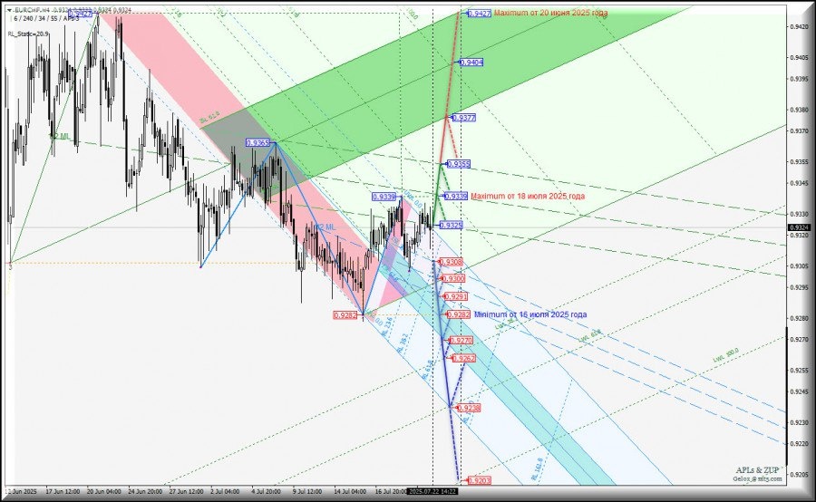 https://basechop.ru/wordpress/?p=50508 Операционный масштаб Minute (таймфрейм h4) EUR/CHF – h4 – обзор вариантов развития движения данного валютного инструмента с 23 июля 2025 г. Предыдущий обзор Euro vs Swiss Franc (таймфрейм h4) от 09.07.2025 г. 14:14 ___________________ Euro vs Swiss Franc Движение EUR/CHF-h4 с 23 июля 2025 года получит свое развитие исходя из отработки и направления пробоя диапазона: – уровень сопротивления 0.9325 на нижней границе канала 1/2 Median Line вил старшего операционного масштаба Minute-h4; – уровень поддержки 0.9308 на верхней границе канала 1/2 Median Line вил младшего операционного масштаба Minuette-h1. Нисходящее движение. При пробое уровня поддержки 0.9308 развитие движения этого кросс инструмента продолжится в границах канала 1/2 Median Line Minuette-h1 (0.9308 – 0.9300 – 0.9291) и зоны равновесия (0.9291 – 0.9282 (minimum от 16 июля 2025 года) – 0.9270) вил младшего операционного масштаба Minuette-h1 с перспективой достижения данной валютн