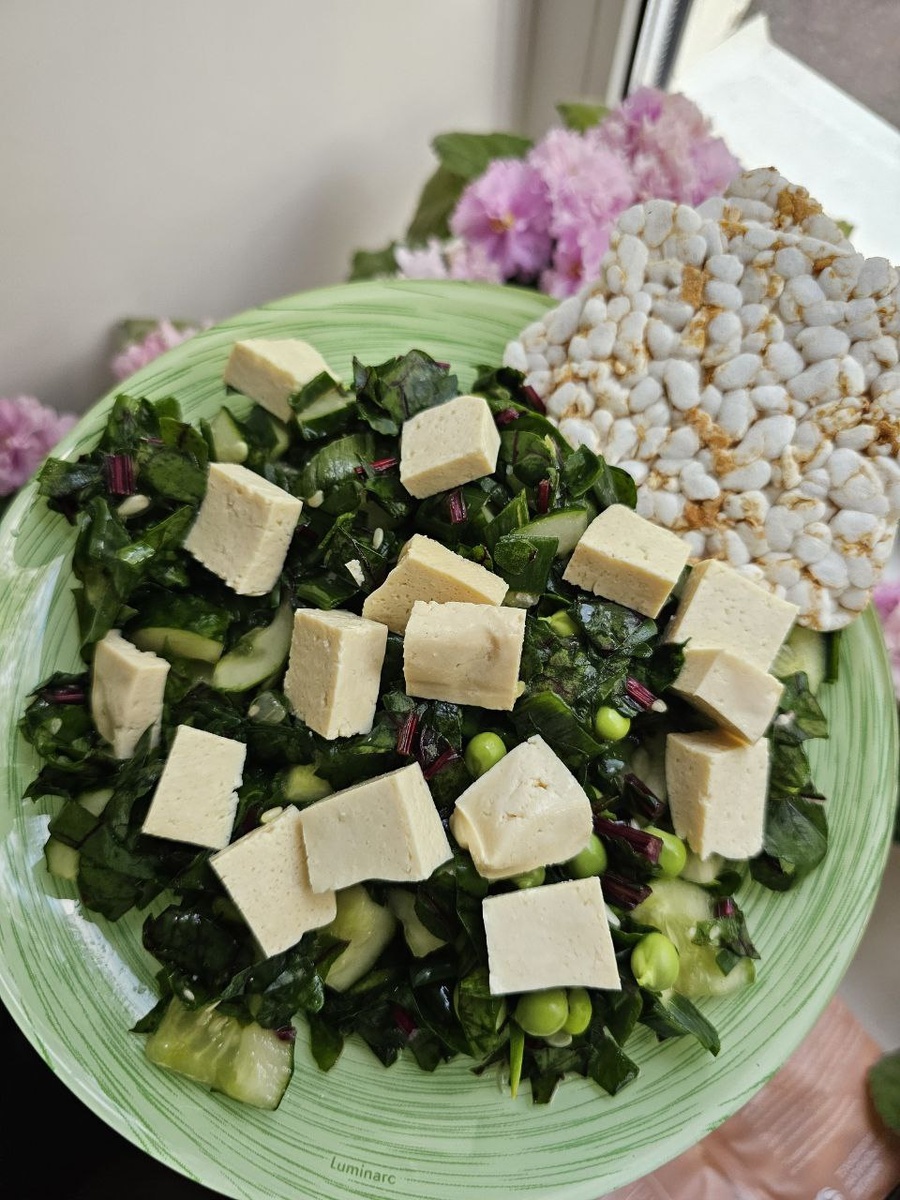 Ещё одна вариация очень лёгкого ужина. Зелено-белково-витаминно! Волей случая у меня на кухне оказалась молодая свекла с листьями. И я эти листья использую в салате. Пользуюсь сезонной доступностью, так сказать. Приготовление: Нарезаю мелко листья, поливаю лимонным 🍋 соком, посыпаю солью и хорошенько разминаю руками, чтобы сок и соль немного как бы замариновали эти листья. Далее можно добавить еще что-то из овощей по вкусу и перемешать. В итоге у меня тут в салате: Листья свеклы Зелёный лук Зелёный свежий горошек Огурец Сок лимона Соль Кусочки тофу классического (белковая составляющая) И парочка хлебцев из бурого риса Что имею по кбжу на порцию: ~230 ккал, б 15, ж 6, у ~30 Оказывается, листья свеклы (aka "ботва" 😁) очень богаты на витаминчики: С, К, группы В, сера и фосфор! Вот как. Используете листья свеклы в пищу или нещадно выбрасываете? 😁 Раньше я еще варила борщ с ними, но супы не часто готовлю) #ужин