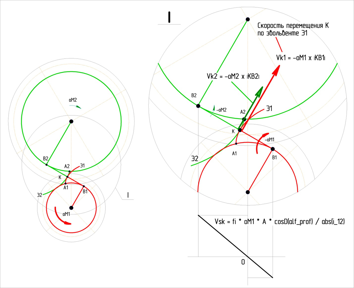 Сие: из этюдов к Единой Кинематической Теории Зубчатых Передач (ЕКТЗП). Рассмотрим наружное зацепление цилиндрических зубчатых колёс при постоянном передаточном отношении. Пусть боковые поверхности зубьев будут эвольвентами окружностей (рис.1). Применяя метод Р.Виллиса, остановим вращение малого зубчатого колеса. Очевидно, что мгновенная скорость перемещения точки контакта сопряжённых эвольвент будет Vk1. Если же остановить другое зубчатое колесо, то Vk2. Скорость взаимного скольжения эвольвентных профилей двух колёс: Vsk - будет разностью между Vk1 и Vk2. Рис.1 Для внутреннего зацепления картина будет такой: Рис.2 Так что…