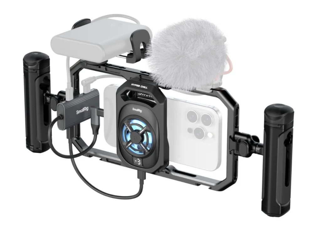 Компания SmallRig представила новый массивный комплект с системой охлаждения для длительных прямых трансляций и съёмки на смартфон. В него входят: клетка, рукотяки с поддержкой выбора угла, резьбовой адаптер для 67 мм, зажим для установки внешнего аккумулятора, а также докстанция-концентратор для подключения дополнительных устройств. Цена 149 долларов (11 тысяч рублей по текущему курсу). Две основные задачи комплекта, который серьезно увеличит ваш сетап в габаритах, это возможность эргономичного подключения дополнительного оборудования, а также сохранение работоспособности смартфона в условиях длительных съемок. Комплект собран таким образом, чтобы обеспечить совместимость с 99% смартфонов на рынке. То есть, он подойдет не только для iPhone (только этот смартфон по какой-то причине демонстрируется в официальных изображениях системы), но для других моделей. Высокоэффективная система охлаждения мощностью 15 Вт объединяет активное охлаждение с многофункциональным расширением, обеспечивая
