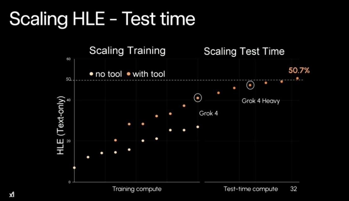 Еще более впечатляющий результат у Grok 4 Heavy – специальной «тяжелой» версии, где несколько обычных Grok 4 работают параллельно. Концептуально это похоже на многоядерный процессор или двухканальную оперативную память. В HLE она набрала 50.7%.