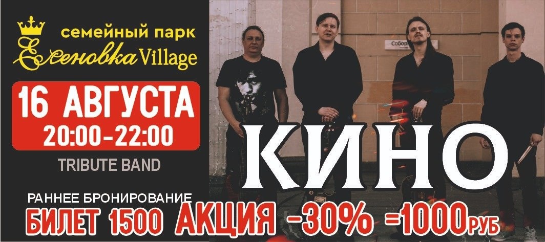 🎸 Друзья! 16 августа в 20:00 приглашаем вас на особенный концерт трибьют-группы *КИНО* 🎤✨ 📍 Соберемся в Еленовке, чтобы почтить память Виктора Цоя — легенды русского рока. 🎶🌟 На сцене прозвучат его культовые песни, которые навсегда останутся в сердцах миллионов. ❤🎵. Приезжайте, в память о великом вспомним, как музыка объединяет и вдохновляет! 🎸🔥 🎟 Билеты можно приобрести в кассе парка или на сайте - www.elenovka.ru ‼АКЦИЯ «РАНЕЕ БРОНИРОВАНИЕ» -50%, цена билета 750₽ вместо 1500₽. 📍Мы находимся: село Ивановское, Кочубеевский район, 20 км в сторону Черкесска - https://yandex.ru/maps/org/29422796664 🚗🌳 📍Подпишись на актуальные новости в наших соцсетях: 📲 https://dzen.ru/id/65b6852a5485845767ca4ed7 ▶ https://m.vk.com/elenovka26 📍Телефон: 89197577430, 89383000935