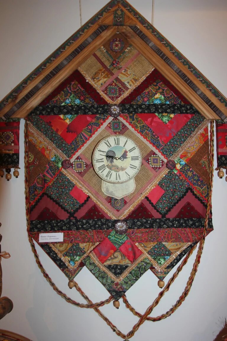 На втором этаже Палат – работы мастера лоскутной пластики Валентины Казакевич. Её творчество — это превращение обычных вещей в нечто удивительное: панно из лоскутов, аппликации, наполненные теплом войлочные картины и причудливые поделки из старых предметов быта. Каждая работа Валентины Львовны – это история, сотканная из лоскутков, эмоций и вдохновения, где прошлое встречается с настоящим, а обыденное становится волшебным. Произведения мастера находятся в музеях народного творчества в Калуге, Москве, а также в частных собраниях в Америке, Швейцарии, Италии, Корее, Германии, Польше. Сотрудничает Валентина Львовна и с калужским драмтеатром театром. Её произведения органично вписались в его интерьер, а театральную библиотеку теперь украшают необычные часы-панно с театральной маской – словно символ вечного диалога между временем и искусством. Панно «Теремок». Семья Казакевич хорошо известна в Калуге. Мать Валентины, Вера Васильевна, приехала в наш город из Ленинграда и посвятила себя музей