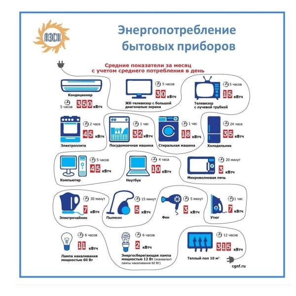Телевизор, стиральная машина занимают третье почетное место – по 20 кВт-ч. Чтобы определить примерный объем электропотребления, надо посчитать количество приборов, электролампочек в доме или в квартире и суммировать их месячный расход.
