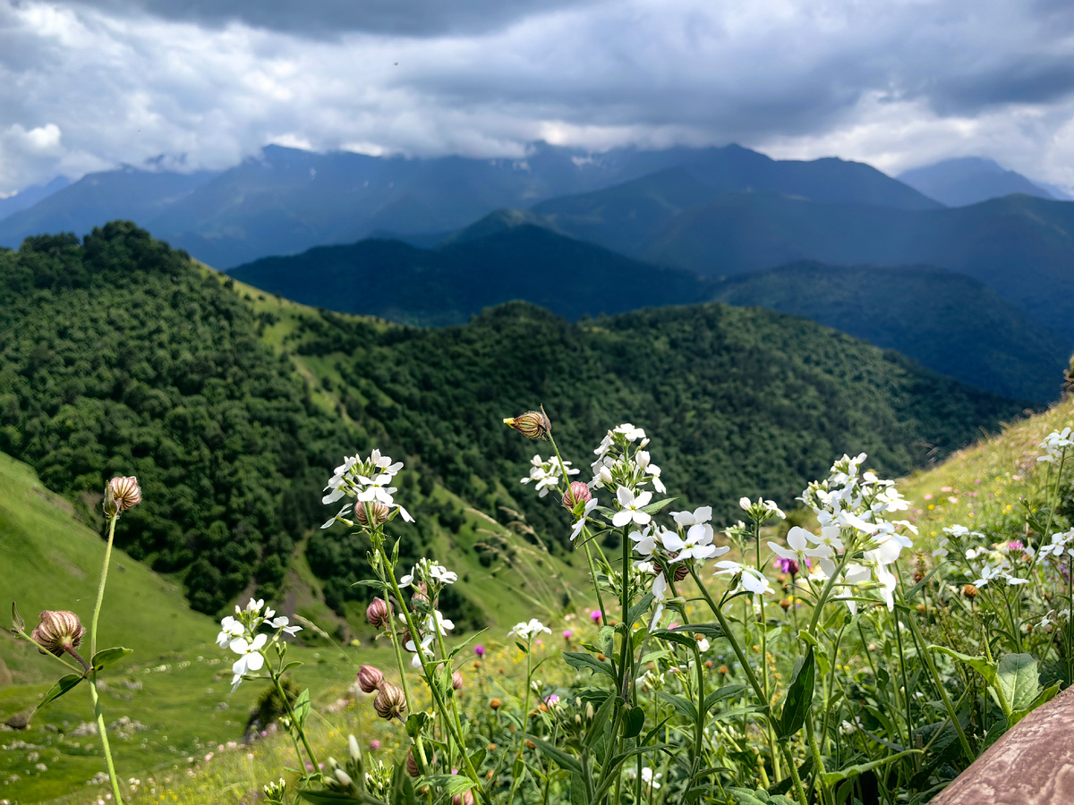 Говорят, это одно из самых живописных мест Ингушетии. Дорога с хорошим асфальтом и яркой разметкой петляет между зелёных склонов, отвесных скал и цветущих полей.