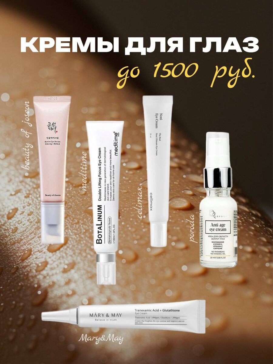 #подборки Помню, вы просили поделиться хорошими бюджетными кремами для век. И в памяти сразу появились эти 5 товарищей. Знаю, что цена на них может разниться от магазина к магазину. До 1500 руб. я их нашла на маркетплейсах у официальных магазинов (кореанбутик, кремшоп др.): — Beauty of Joseon Revive Eye Serum Ginseng+Retinal. Крем с ретиналем и женьшенем. Обожаю его. Плотный, питательный. Через несколько недель заметно "стирает" мимические морщинки. Я мажу и на глаза, и на лицо. — Meditime Botalinum. Тут хорошая база антивозрастных пептидов, плюс осветляющие компоненты и активы для крепкого барьера. Текстура средней плотности. — Celimax The Real Noni Ultimate Eye Cream. В меру плотный и питательный. Можно использовать, если настиг дерматит в зоне вокруг глаз. Некоторое время ощущается "барьерность" на коже. Из активов - пептиды-миорелаксанты, бакучиол, ниацинамид (куда ж без него!) — Poroda Anti Age Cream. Приятная легкая текстура и активный состав: 3% ниацинамида, 3% кофеина, 1.5%