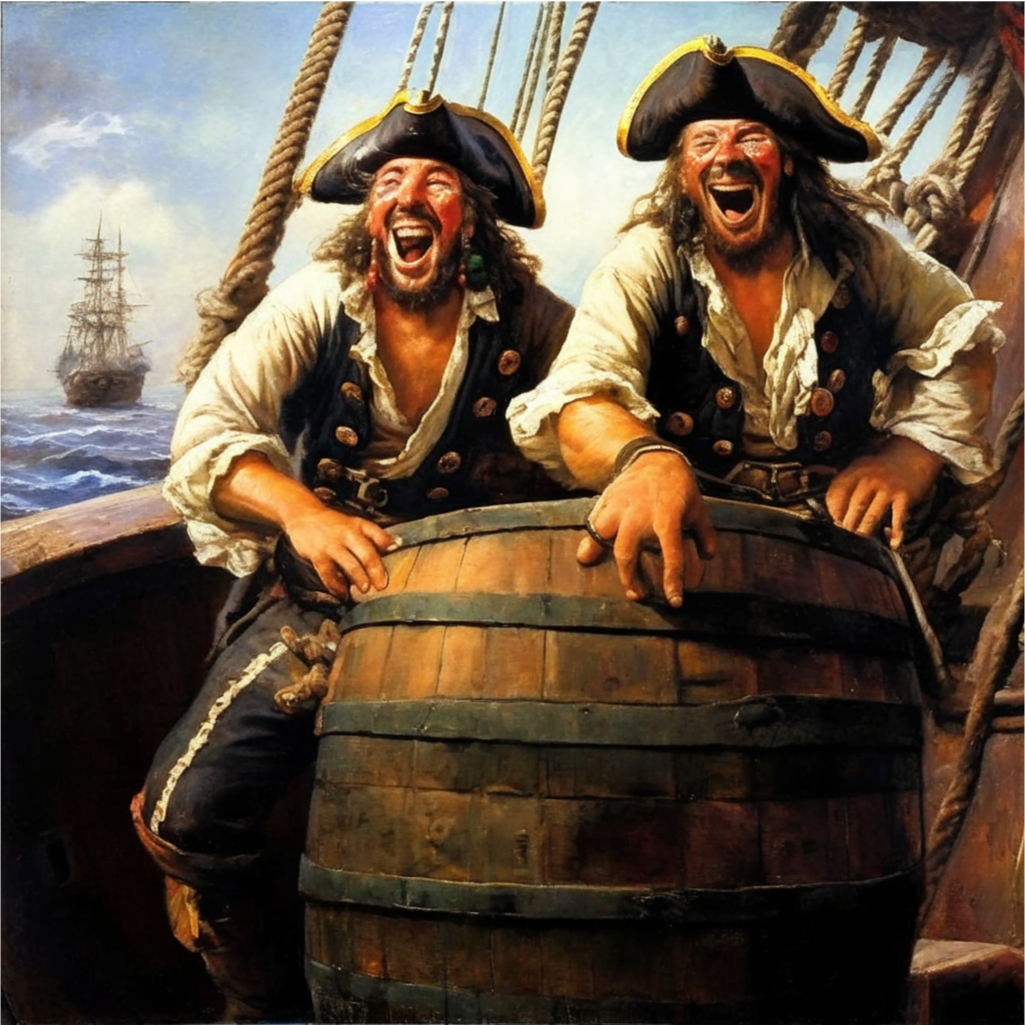 Теперь настала моя очередь покинуть корабль. Поскольку лезть в воду мне совершенно не хотелось, я решился на авантюру, а почему бы и нет, в конце концов? Времени у меня оставалось мало. Вот-вот выставят часовых, и выбраться станет гораздо труднее. Стараясь не шуметь, пригнувшись, я прошёл вдоль борта к трапу. Вроде бы никого. Недавно стоявшая здесь троица куда-то ушла. В этот момент из надстройки вышли два пирата и, громко смеясь, вероятно, над какой-то шуткой, прошли буквально в метре от меня. Они катили бочку с вином.
