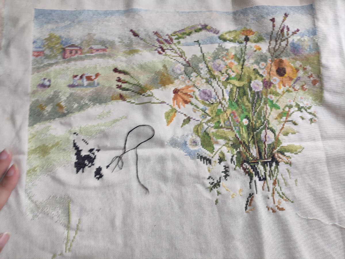В этот раз сложилось всё удачно! Я хотела вышивать "Утро в деревне" - так и получилось. И всё благодаря вам. 1+1+2+1+1+1+1+4+1+4+2+3+2+6+2+2+4+1+5+2+3+3+1+5+3+3+1+1+1+1+1+1+4+1+1+2+2+2+6+5+3=96 Считаю среднее 96:41=2.3 - просто для интереса, ни на что это не влияет. Он и на готовой работе будет "покоцанный", драный, совершенно не холеный, блохастенький котик. А в процессе так вообще страшненький. Зато сразу понятно, что кот молодой, озорной и боевой! Себя в обиду он не даст. Дел в деревне у него много: то за мышкой погнаться, то с соседскими котами разобраться. Заботы одни. Когда тут лежать на солнышке? Забежав на минутку на крыльцо, надо привести себя в порядок. Пока делал фотографию - пришёл проверяльщик. Недовольный... мало вышила. В воде оттенки близкие и наверно вам кажется, что вышито одним цветом. На самом деле тут есть небольшие горизонтальные полосочки. Вот их и вышивала. На следующую неделю у меня нет предпочтений. Можно голосовать за всё!
