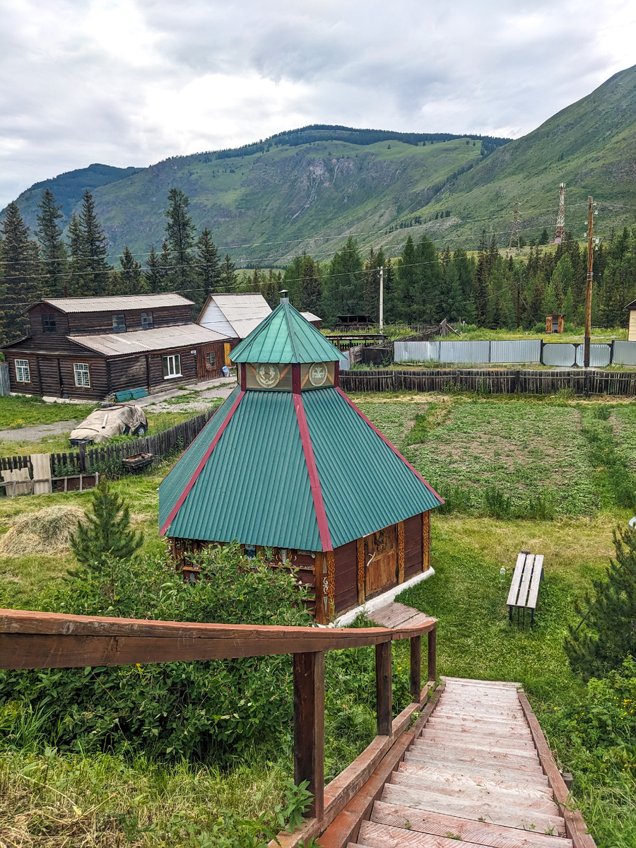 Акташ – маленький поселок, расположенный вдоль Чуйского тракта. Много туристов, а мы ещё попали как раз перед каким-то горным забегом, так что постоянно встречали бегунов. Акташ был основан для добычи ртути, лесозаготовок и переработки древесины. Но теперь это чисто туристическое место. Из развлечений в самом Акташе – прогулка по двум супермаркетам и нескольким сувенирным магазинам. Чтобы посмотреть что-то ещё, нужно ехать на машине. Если вы без машины, можно купить экскурсии, которые вам непременно предложат. Но у нас тратить деньги на экскурсии в планы не входило. Мы думали, чем заняться, и на просторах интернета я случайно наткнулась на частный музей – Музей национальной одежды и сувениров Оминых. На территории расположены гостевой дом и сам этномузей. Когда мы пришли, на территории никого не было видно. Мы позвонили по номеру с таблички, висевшей рядом с домиком. Нам сказали подождать внизу. Внизу на территории стоял традиционный алтайский домик, вокруг были расположены камни