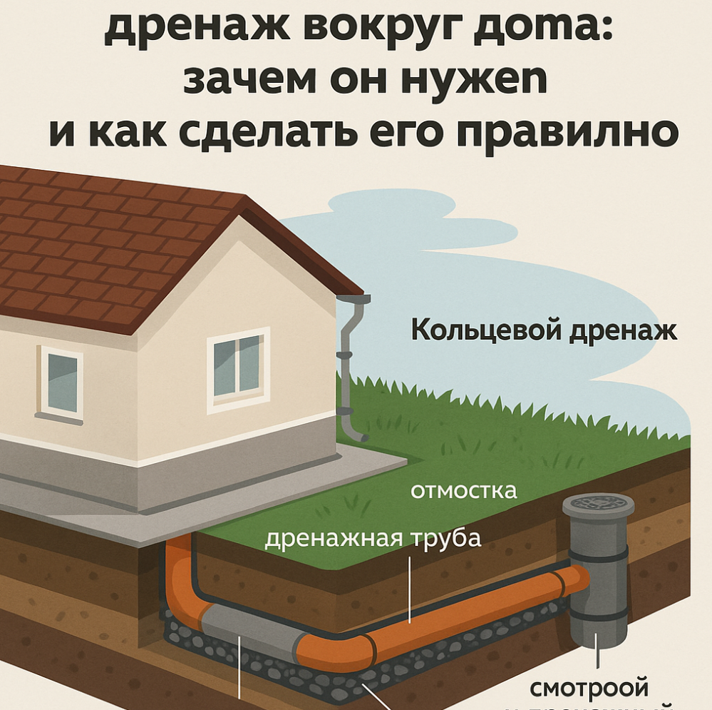 Когда мы говорим про строительство дома, чаще всего думаем о фундаменте, стенах, кровле. Но один из самых недооценённых, но критически важных элементов — это дренажная система. Особенно если дом строится на участке с глинистой почвой, в низине или в регионе с высоким уровнем грунтовых вод. В этой статье я расскажу, зачем нужен дренаж, к чему приводит его отсутствие, и как сделать его правильно. Всё — простым языком, но без потери инженерного смысла. Даже если у вас шикарная гидроизоляция и бетон марки М350, вода у фундамента — это всегда риск. Вот что происходит, когда дренажа нет: Многие думают, что если сделали отмостку — вода уйдёт. Нет. Отмостка защищает только от дождевой воды, но не решает проблему грунтовых вод. А если участок находится в низине, вода может просто стекать от соседей прямо к вам. Существует два основных типа: Вот пошаговая схема, как делают дренаж профессиональные подрядчики: Если у вас есть опыт земляных работ и базовые строительные навыки — вполне возможно. Но