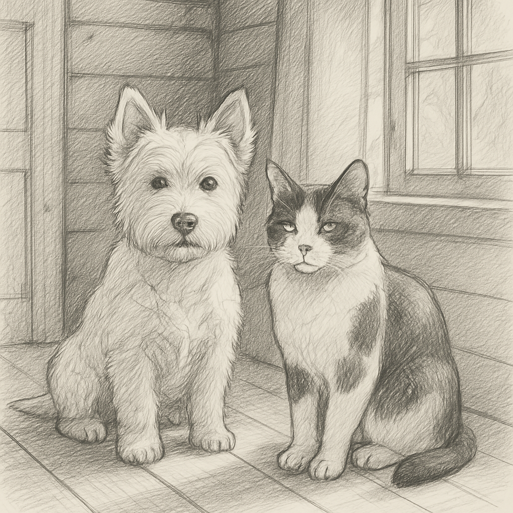 Мы лежали под кроватью, слушали, как дождь барабанит по крыше, и каждый громкий удар заставлял нас вздрагивать. Но вместе было не так страшно. Я чувствовал, как Барсик дышит рядом, и даже его хвост иногда касался моего носа. Он тихонько мурлыкал, а я уткнулся носом ему в бок и старался не дрожать слишком сильно — ведь я, всё-таки, охраняю дом… иногда..