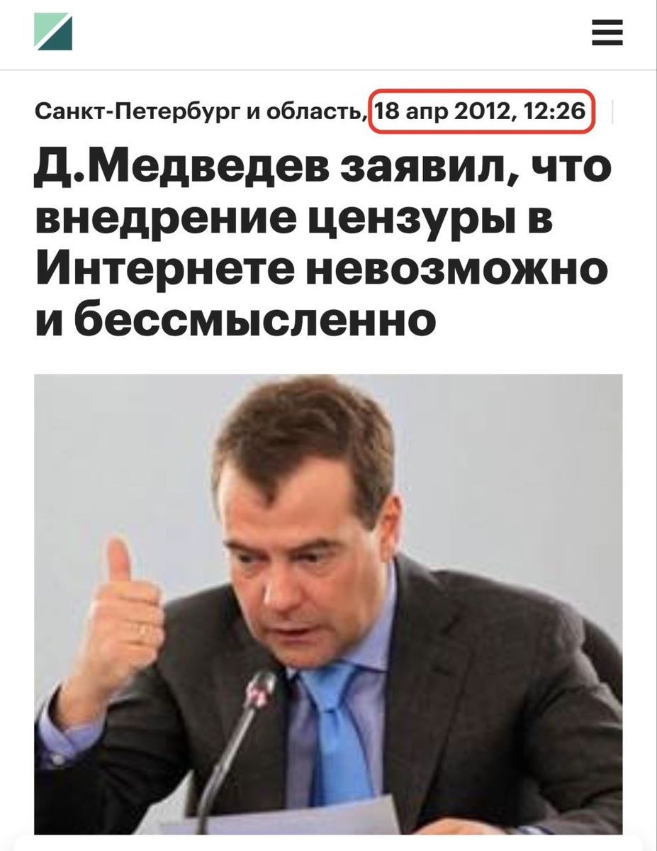 🗣Медведев: «Цензура в интернете невозможна и бессмысленна» ~ 18 апреля 2012 года Президент России Дмитрий Медведев в видеообращении к участникам форума «Интернет и бизнес» высказывался против цензуры в Сети. Он подчеркивал, что интернет может быть использован и во благо, и во вред, но введение ограничений на свободу слова недопустимо: «Речь не идет и не будет идти о какой-либо цензуре в Интернете. Это невозможно, я неоднократно об этом говорил. Это просто бессмысленно», — Медведев #Медведев #Цензура 🏛History_detail. Подписаться