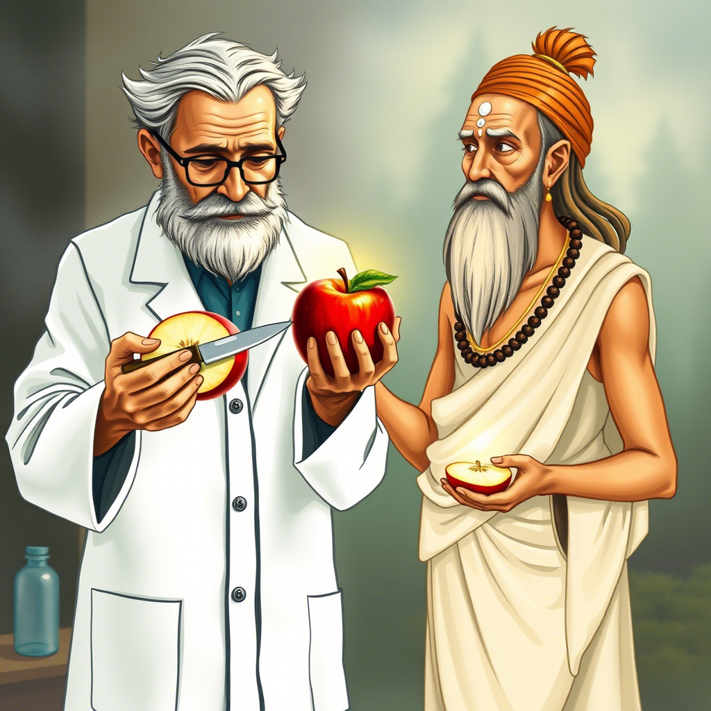 Два человека держат в руках яблоко. Западный учёный разрежет его на дольки, изучит химический состав и опишет питательные свойства. Индийский мудрец созерцает целое яблоко, ощущая его связь с солнцем, дождём и землёй — и через это постигает единство мироздания. Этот контраст раскрывает глубинное различие в понимании самого знания: как внешнего объекта для усвоения или как внутреннего пути к преображению сознания. По мнению Философа Александра Пятигорского это не просто культурное различие, а два принципиально разных способа бытия в мире. В европейской традиции знание — это сокровище, которое нужно добыть. Как отмечал Пятигорский, для западного человека знание всегда внешне: его «находят», «получают» или «достигают» через эксперименты, книги или образование. Оно подобно драгоценному камню, который можно вставить в любую оправу — будь то учёный, студент или компьютер. Философ иллюстрирует это примерами из научной фантастики: в рассказе Набокова Ultima Thule герой сходит с ума, получи