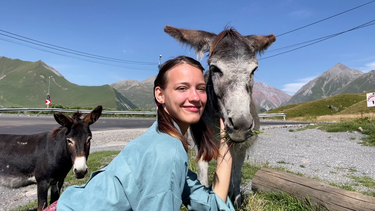 Я помахал ему рукой и отъехал на прежнее место. Ну ладно, дают — бери, бьют — беги. Пусть лежат, может и пригодятся когда. (не пригодились, лежат уже три года как сувенир). Позавтракали, автобус загрузил поляков и умчал на какие-то достопримечательности. Нам тоже пора бы, вчера вот Арку Дружбы в сумерках проскочили, надо заехать. Девчонки увидели осликов и побежали к ним, а я запустил коптер, пролететься над Гудаури.