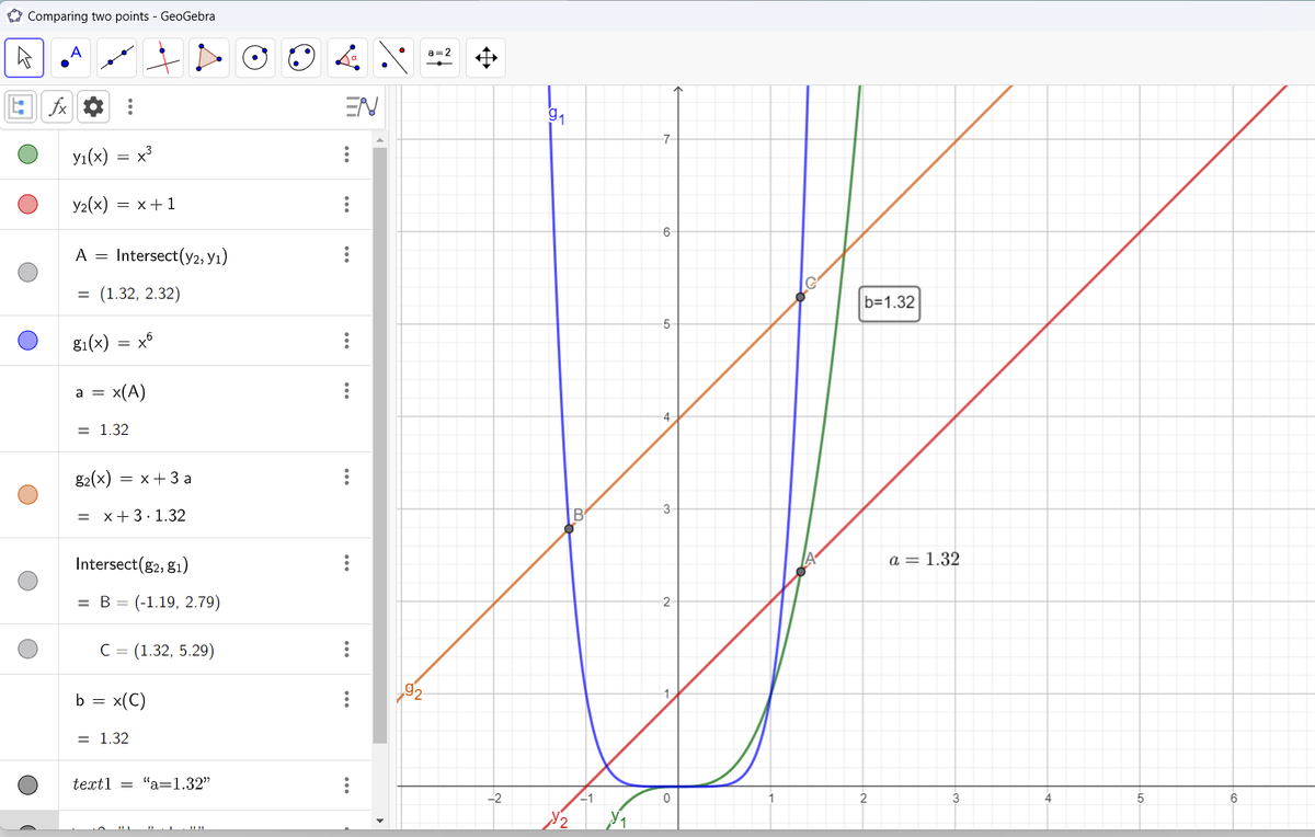 Второе задание ДВИ по математике было обычно либо на прогрессии, либо на последовательности. В свежем варианте была необычная интерпретация. Весьма нестандартное задание. Узнаём старый и добрый мехмат. Итак, нужно было сравнивать два положительных действительных числа a и b, удовлетворяющие уравнениям: a^3=a+1 и b^6=b+3a. Это, кстати, тот случай, когда приближённые численные методы не дают ответа на задачу. Geoegebra слишком округляет и получаются два равных значения. Первое уравнение - это пересечение кубической функции и прямой. Второе уравнение - это пересечение прямой и шестой степени аргумента. В обоих случаях программа выдаёт ответ a=b=1,24. Как же решить задачу аналитически?! Например, давайте рассмотрим функцию f(x)=x^6-x, Её производная равна 6x^5-1 и для всех x, больших 1, она строго положительна, то есть f(x) строго монотонно возрастает для всех x>1. Сопоставим наши аргументы a и b с единицей. Эскизы графиков мы поняли. В положительной плоскости аргумента первое уравнение за