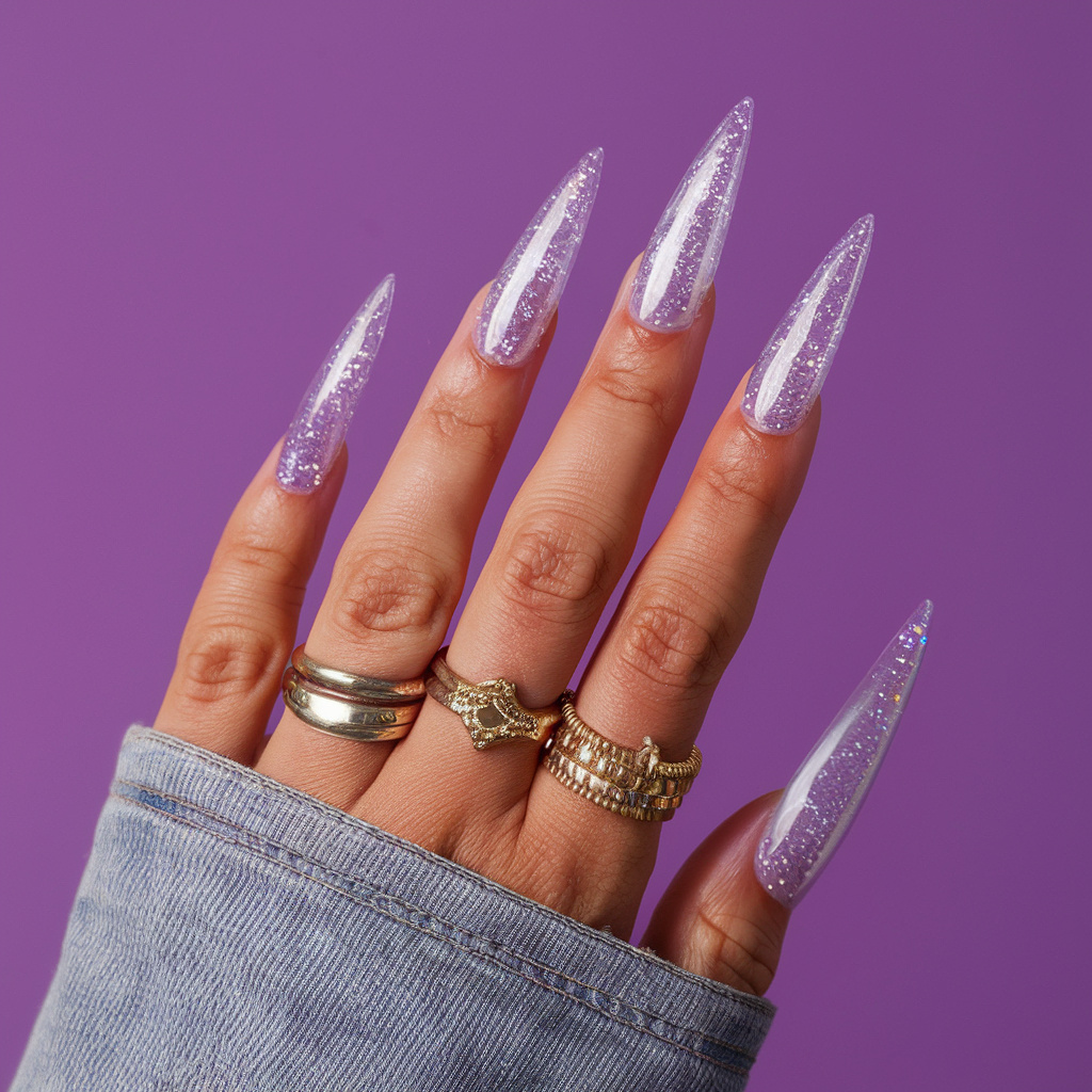 На ногтях выполнен эффект омбре: от светло-фиолетового у основания до более тёмного фиолетового на кончиках, с блёстками. Блёстки придают ногтям волшебный и причудливый вид, что делает их идеальным вариантом для тех, кто любит сиять.