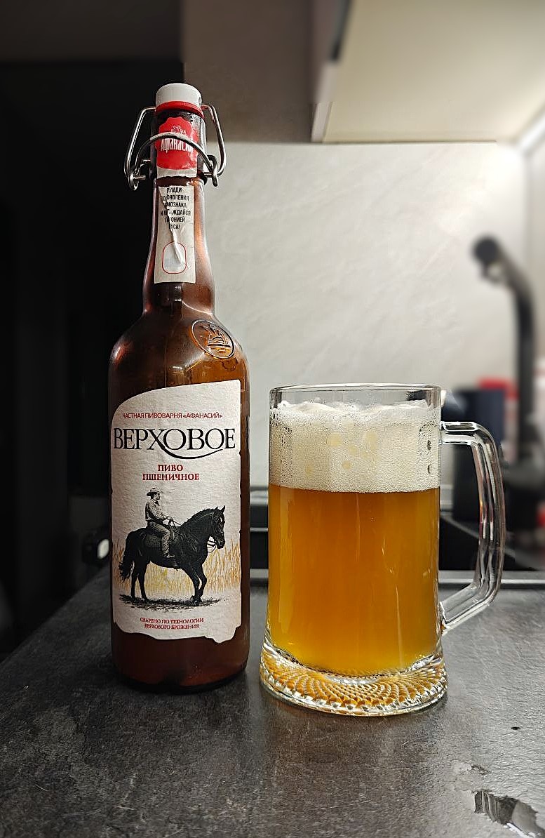 Всем привет! Продолжаю ознакамливаться с продукцией холдинга Афанасий (когда узнал что это холдинг в который входит и горнолыжный парк, семейная ферма, эко-бутики и даже частная охранная организация был очень удивлен). О холдинге Афанасий я расскажу в следующий раз, когда доберусь до оригинального Афанасия и посмотрю изменился ли он, или он на вкус такой же как и раньше. А сегодня давайте расскажу свое мнение о пшеничке "Верховое". Классифицируется как светлое пиво, нефильтрованное, пастеризованное, осветленное. Алкоголь 4,9% плотность 12%. Продается в бутылке темно-коричневого цвета объемом 0,75 л. с с гравировкой в виде ладьи и бугельной пробкой. Этикетка хорошего качества, но почему то с разными шрифтами, с изображением, внезапно, ковбоя, предполагаю это тонкий намек на название пива, ковбой - это всадник, а всадник это верховая езда. Помимо этикетки на бутылку присутствует этикетка с термонаклейкой, для определения лучшей температуры для распития. Срок годности пива – 240 суток в