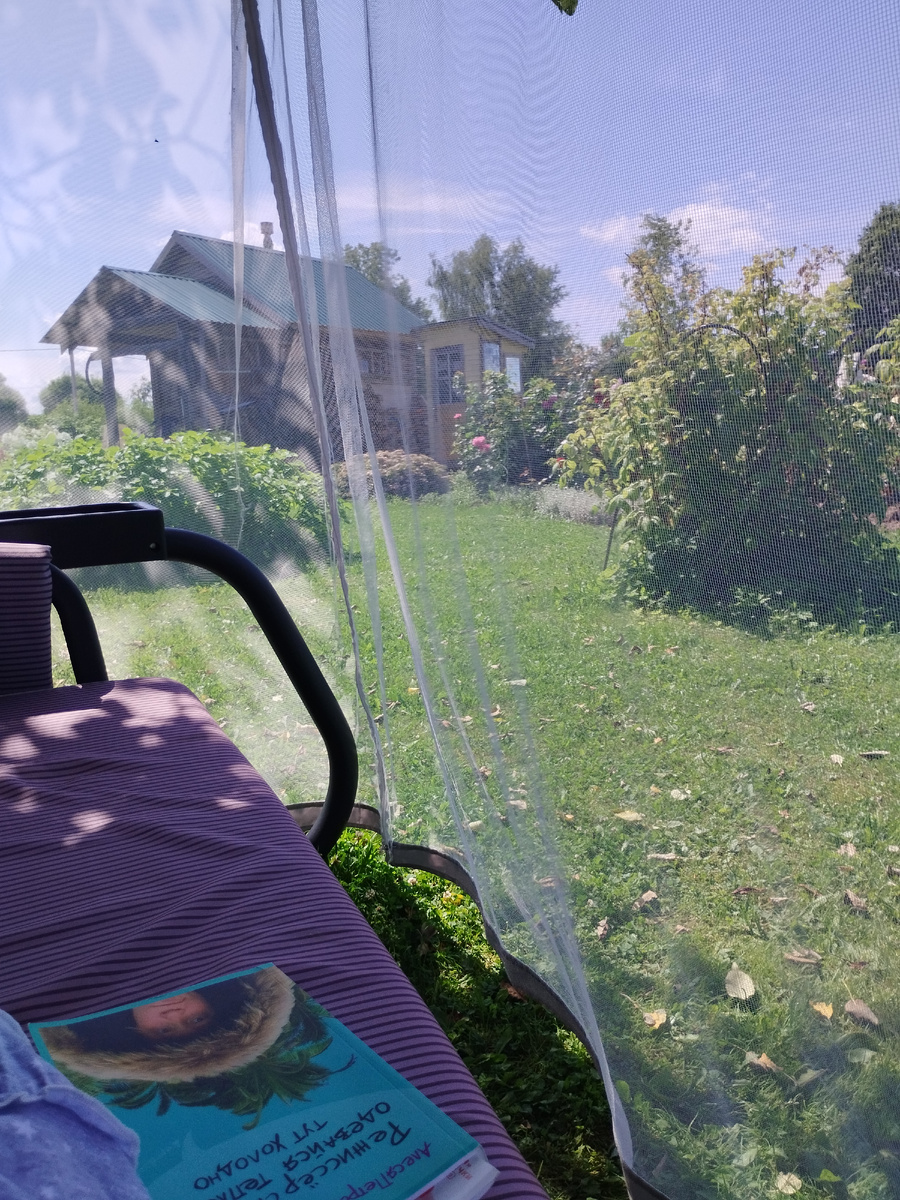 Лежала на диванчике-качелях, читала, наблюдала за птичками. Птицы то ли совсем страх потеряли, то ли им меня за сеткой не видно, но они топтались чуть ли не по моим тапках (извините за тавтологию), птиц привлекали мошки на сетке. А мошек, как ни странно, я совсем не интересовала, такое впечатление, что попав под сетку, у мошек была одна цель - выбраться и я их совсем не интересовала.