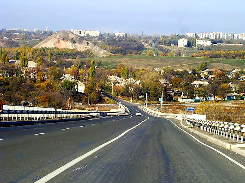 Вскоре Кадиевка остается позади, под колесами гудит асфальт, по сторонам посадки, впереди открывается долина. Внизу на солнце блестит река, переезжаем высокий бетонный мост, автомобиль поднимается вверх по склону. За ним необъятные просторы, у горизонта синеют терриконы шахт, справа еще какой-то город. Минуем и его.
