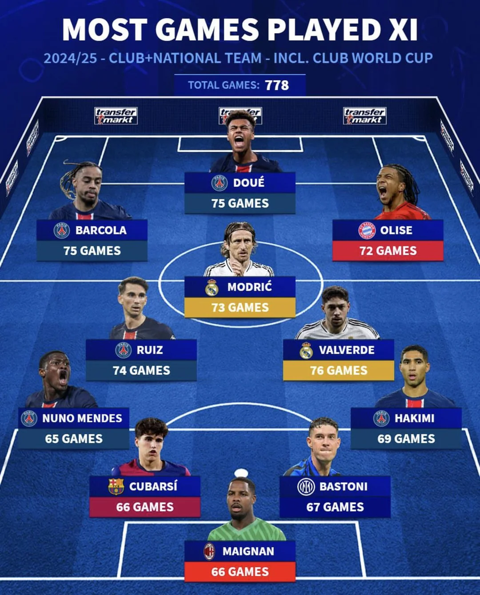 Transfermarkt выкатил очередную сборную игроков, которые в закончившемся сезоне провели наибольшее количество матчей за клубы и сборные. Одиннадцать футболистов в общем записали на свой счет аж 778 игр − в среднем практически по 71. В топ вошли следующие игроки: Майк Меньян («Милан») − Нуну Мендеш («ПСЖ), Пау Кубарси («Барселона»), Алессандро Бастони («Интер»), Ашраф Хакими («ПСЖ») − Фабиан Руис («ПСЖ»), Федерико Вальверде («Мадрид») − Брэдли Барколя («ПСЖ»), Лука Модрич («Мадрид»), Майкл Олисе («Бавария») − Дезире Дуэ («ПСЖ»). В топ попали сразу пятеро игроков «ПСЖ» и это неудивительно, ведь все они участвовали в клубном чемпионате мира, а также выступают за сборные родных стран. Чье наличие может удивить, так это Пау Кубарси и Майка Меньяна. Защитник выходил не во всех играх «Барселоны», а также, как и Меньян, не ездил в США на клубный ЧМ. «Милану» же повезло, ведь в их составе теперь будет Лука Модрич, который в 39 лет способен отбегать целых 73 матча за сезон. А кого вы ожидали уви