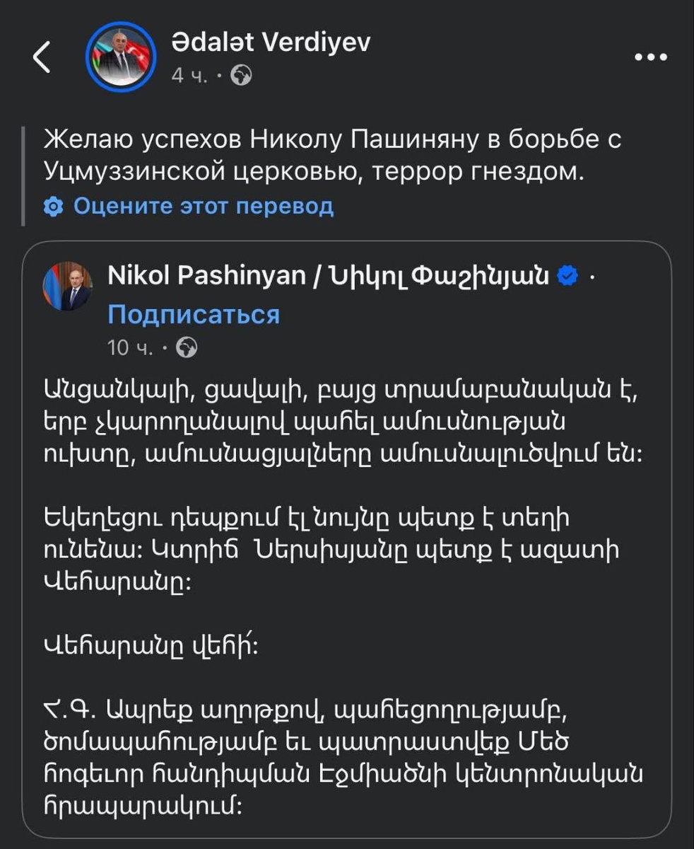 Ադրբեջանի քաղաքացիներն ու պաշտոնյաները հաջողություն են մաղթում նիկոլին մեր Մայր Աթոռի ու մեր Վեհափառ Հայրապետի դեմ պայքարում։