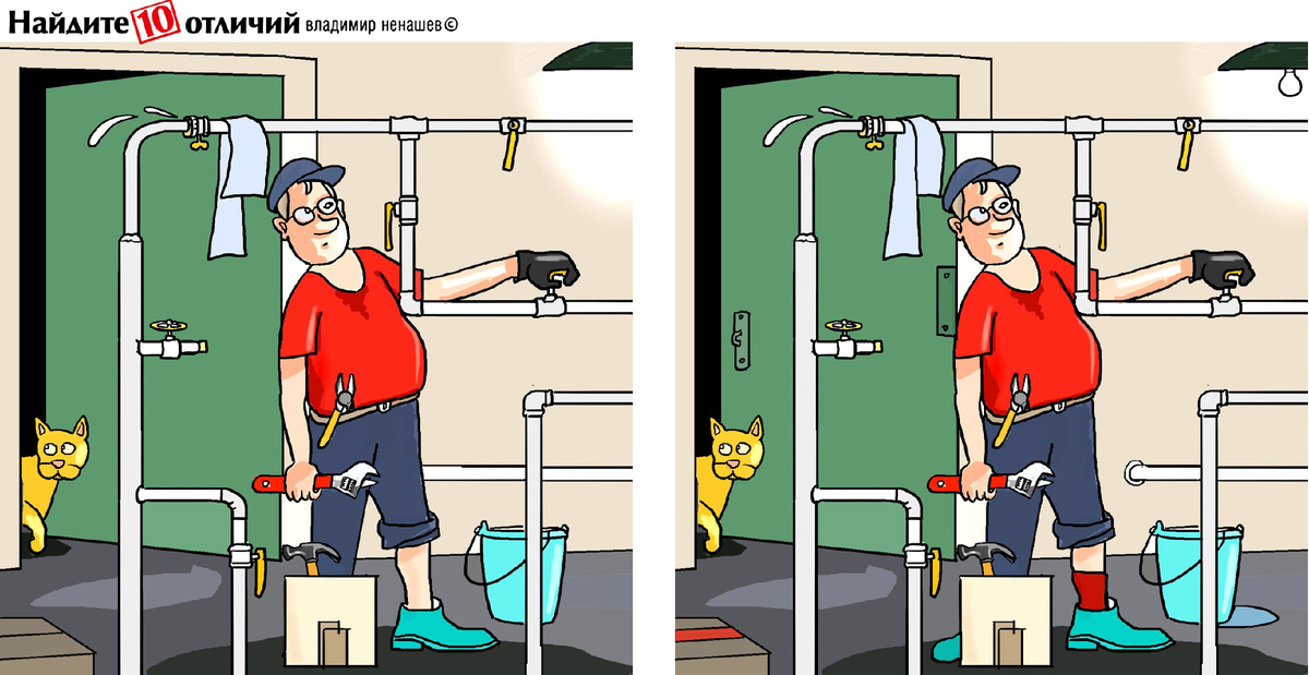 10 отличий и тест на внимание. Мужчина в нашей загадке разбирается с лабиринтом труб. Позитив.