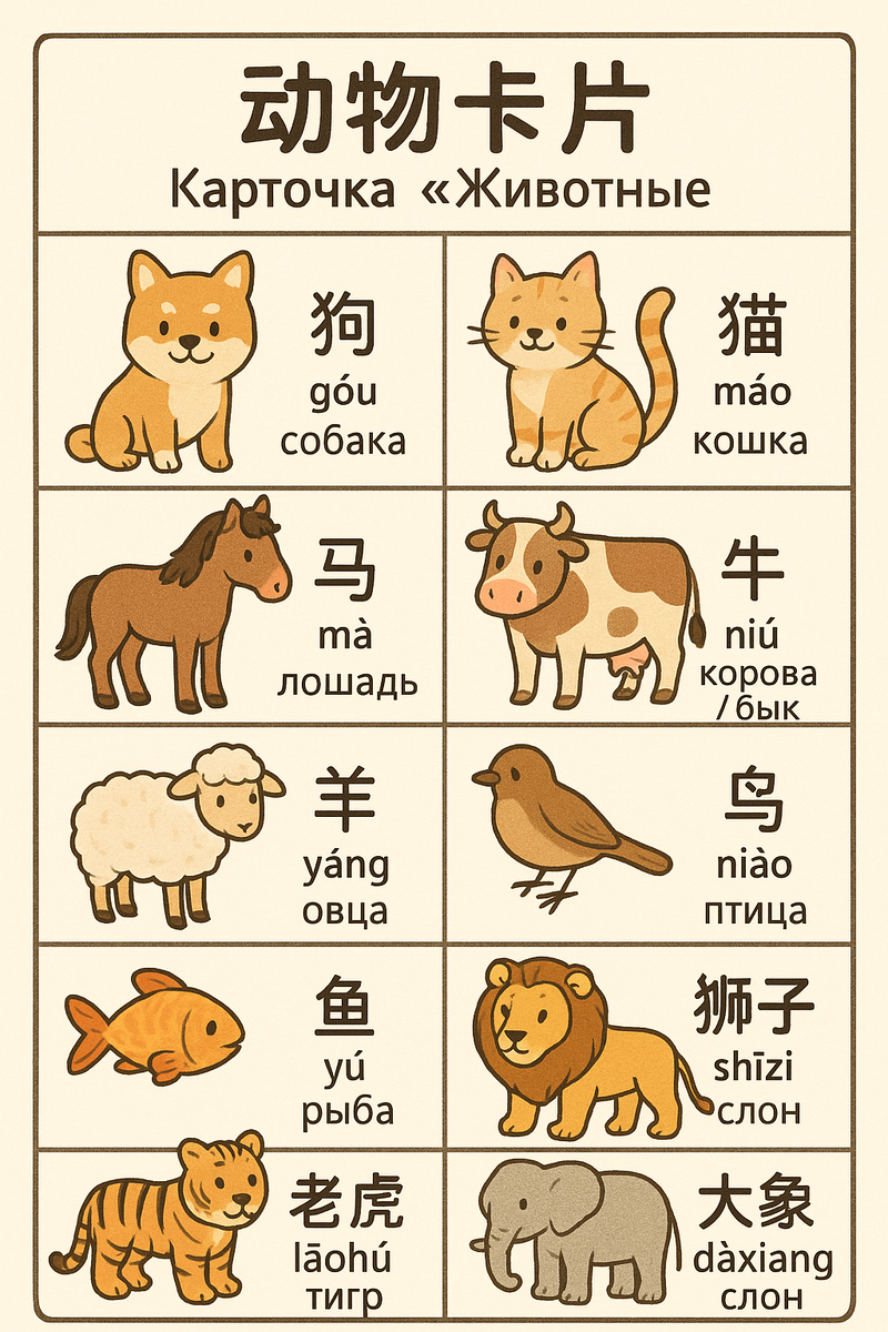 Карточки «Животные» на китайском языке