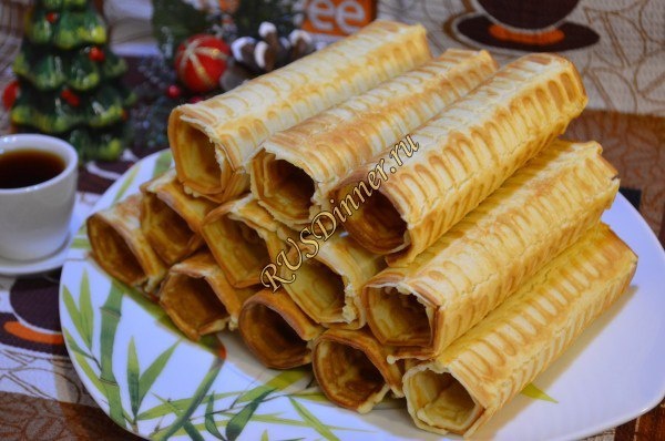 Хрустящие вафельные трубочки От автора: Из данного количества ингредиентов у меня получилось 12 хрустящих вафельных трубочек. Ингредиенты: Яйцо - 3 шт. Сахар - 100 гр. Масло сливочное - 120 гр. Разрыхлитель теста - 6 гр. (0,5 ч. л.) Мука - 160 гр. Источник: https://rusdinner.ru/page/hrustjashhie-vafelnye-trubochki