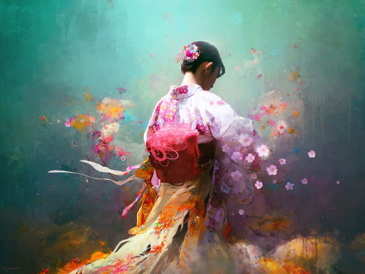 На картине изображена фигура девушки в традиционном японском кимоно, отвернувшейся от зрителя. Её образ окружён рассыпанными цветами сакуры, растворяющимися в ярких пятнах и мягких мазках. Колористика произведения строится на контрасте насыщенного бирюзового фона и теплых оттенков оранжевого, розового и сиреневого. Внимание акцентировано на плавности линий и декоративной насыщенности ткани. Легкие потоки света придают композиции воздушность, а цветочные элементы визуально сливаются с фоном, подчеркивая ощущение тишины и уединения. Стили: Импрессионизм, цифровая живопись, арт-нуво, символизм, современный реализм. Автор работы: Томас Дюбуа, Франция Картина «Сакура» Здесь вы можете наслаждаться картинами современных цифровых художников, которых нет в масс-маркете, и которые можно купить на холсте или бумаге 🤍