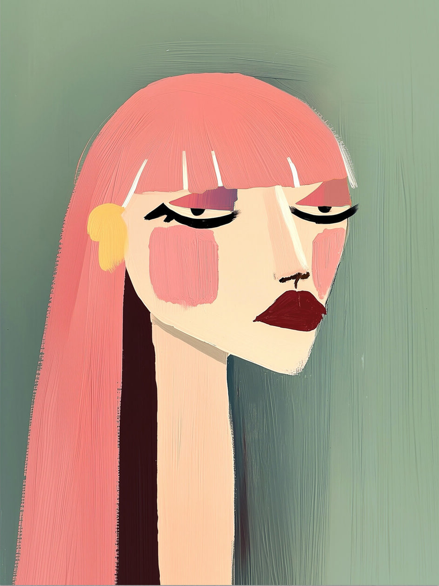 Картина представляет собой портрет женщины с удлинённой шеей и выразительными чертами лица, выполненный в минималистичной манере. Художник использует упрощённые формы и насыщенные цвета: розовые и персиковые оттенки кожи сочетаются с фоном приглушённого зелёного тона. Взгляд героини полон отстранённости и спокойствия. Широкие мазки подчёркивают декоративность образа, а асимметрия и преувеличенные пропорции придают ему особую выразительность. Работа акцентирует внимание на настроении и цвете, а не на реалистичном изображении.