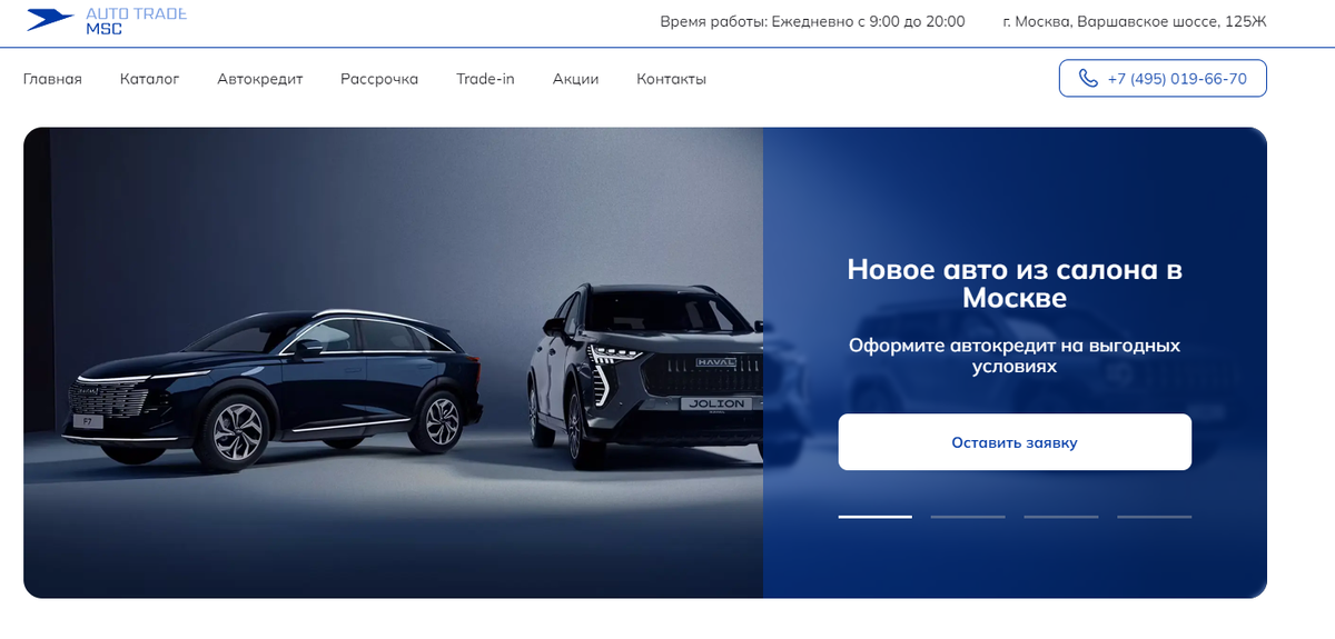 Auto Trade MSK — это автосалон в Москве. Вероятнее всего, является лендингом для сбора заявок. О дилере есть негативные отзывы. Также смущают неоправданно низкие цены на авто, которые размещены в каталоге на лендинге. В автосалоне на Варшавском шоссе 125Ж в Москве можно купить новый автомобиль. Каталог довольно большой, он вмещает более 20 марок. Автомобили продаются по сниженным ценам, верифицированной и обновляемой информации об авто в наличии нет, в каталоге используются не реальные фото ТС. По указанному адресу на картах отмечен другой автосалон — ЭрСиАвтотрейд. Поэтому мы считаем, что Auto Trade MSK — это лендинг вышеуказанного дилера для сбора заявок. Владельцем автоцентра Auto Trade MSK является ООО "ЭРСИ АВТОТРЕЙД" (ИНН: 7726470070). Компания была зарегистрирована в 2020 году. Есть незначительные риски неисполнения обязательств — 4 производств на сумму 23 250,00 руб. Согласно отчетности деятельность компании убыточна. Эксперты отмечают низкую платежеспособность организации. Вла
