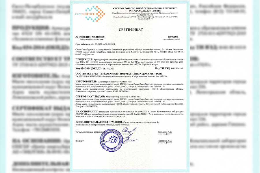 Компания «ЭНЕРГИЯ» получила сертификат СДС СЕРТЭНЕРГО. Таким образом, продукция включена в каталог отечественного оборудования и материалов для предприятий инженерно-энергетического и транспортного комплекса Санкт-Петербурга. В рамках работы по повышению контроля качества продукции, поставляемой на объекты строительства и эксплуатации предприятий инженерно-энергетического комплекса Санкт-Петербурга, СПб ГБУ «Центр энергосбережения» ведёт формирование каталога отечественного оборудования и материалов для предприятий инженерно-энергетического и транспортного комплекса Санкт-Петербурга. Клиновая задвижка фланцевая тип 47GV и пожарный подземный гидрант тип GPP, производимые под торговой маркой DENDOR, прошли необходимые испытания, а АО «ЭНЕРГИЯ» — завод-производитель трубопроводной арматуры — экспертизу производственных процессов, организованную сотрудниками СПб ГБУ «Центр энергосбережения». После проведенных проверок АО «ЭНЕРГИЯ» было включено в «Каталог отечественной продукции». Наше пре