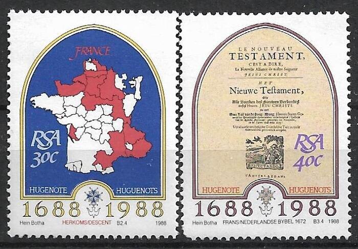 Дюма-отец, Проспер Мериме и другие французы оставили нам увлекательные истории, в которых участвуют люди, называющиеся гугенотами. Из этих произведений мы про гугенотов немножко знаем. Наверное, этих знаний для нас достаточно - не наша эта история. Но когда в коллекции появляется какой-то предмет, суть которого непонятна, хочется приобрести ясность. Вот эта пара Южно-Африканской республики остается для меня непонятной. На марках несколько событий. Они, вероятно, посвящены первому переселению протестантов в южную Африку. В 1685, если правильно помню, очередной король отменил привилегии, данные кальвинистам еще Генрихом Четвертым. Через три года кто-то из эмигрантов добрался до южной оконечности материка. Карта Франции (надеюсь, 17 века?) с указанием провинций, в которых большинство населения приняло кальвинизм. Внизу надпись на немецком: Происхождение. Это понятно: Кальвин и его учение родом из Франции. Но вот вторая марка. На ней воспроизведена то ли обложка, то ли титульный лист проте