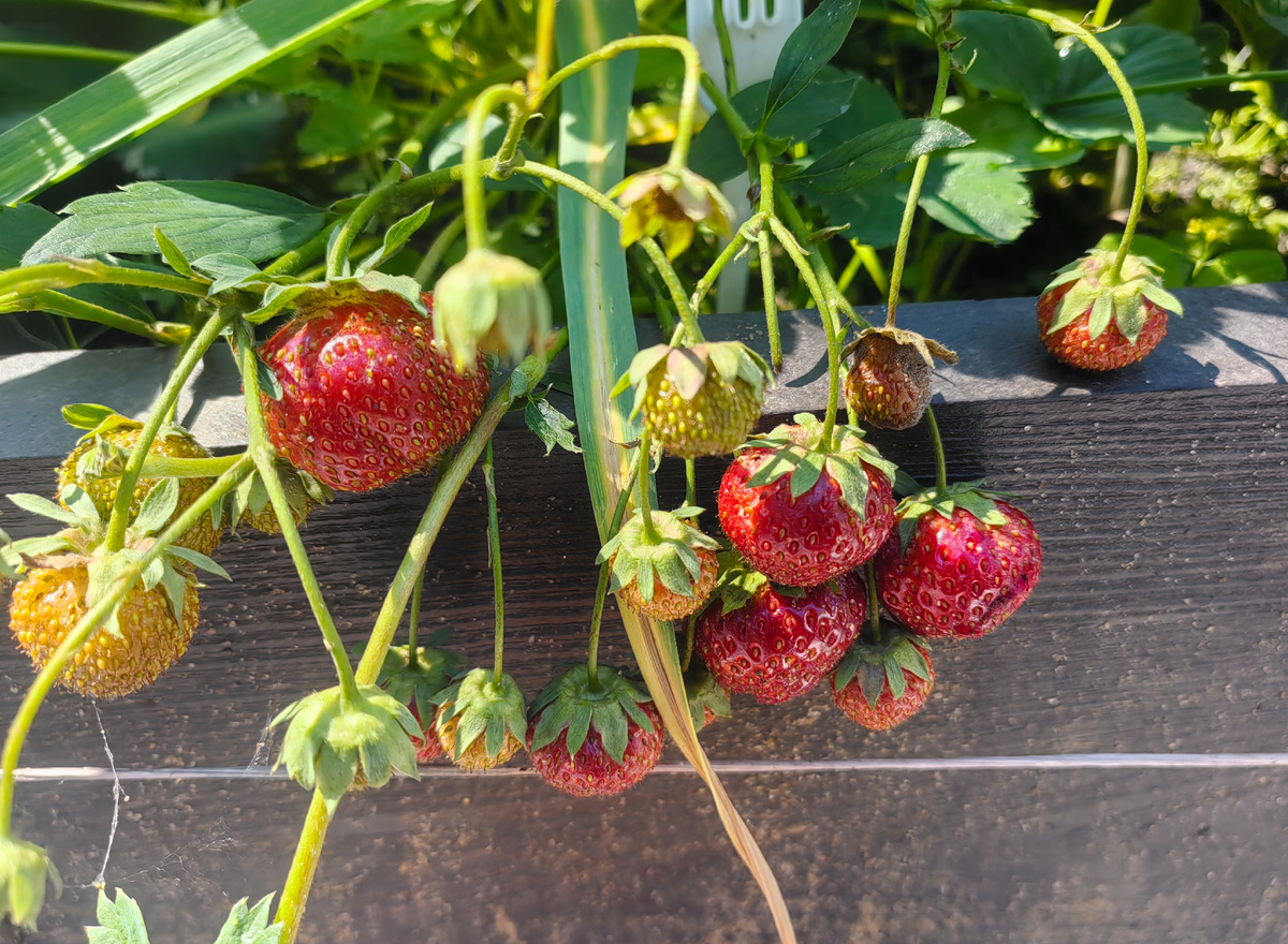 А всё просто. Из-за тех же спутанных в горшочках корней. По идее, их нужно разбирать и срезать запутанные участки. После таких манипуляций клубника хиленькая. Ей нужно время на восстановление.