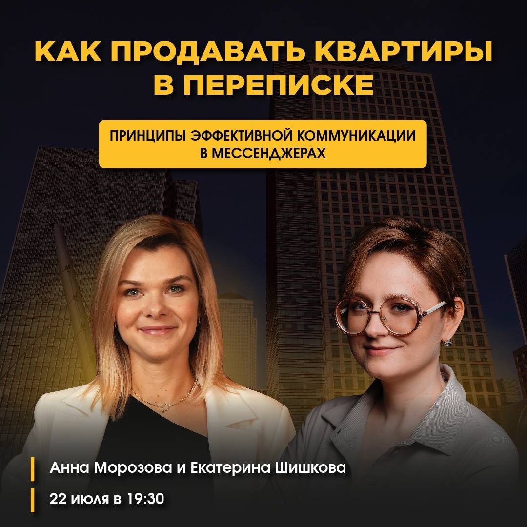 ▶️Эфир: Как продавать квартиры в переписке? 22 июля в 19:30 ко мне в гости придет Анна Морозова: • Управляющий партнер консалтинговой группы BGO. • Эксперт по системам продаж в девелопменте с 2005 года. • Автор книги "Девелопер. Отдел продаж под ключ". • Официальный партнер РГР по образовательной деятельности. • Член Комитета по межрегиональным сделкам РГР. О чём поговорим? 💬 Почему общение с клиентом в чатах - неизбежное зло? 💬 ТОП-5 ошибок в переписке. 💬 Принципы эффективной коммуникации: что помогает вывести клиента на сделку? Этот эфир обязательно нужно увидеть, если вы: • Риелтор или владелец агентства недвижимости, который хочет увеличить конверсию в продажу из чатов. • Руководитель отдела продаж в девелопменте, который хочет внедрить инструмент продаж в переписке на профессиональном уровне. Как присоединиться? Просто будьте в этом канале 22 июля в 19:30. Поставьте реакцию 🔥, если тема эфира актуальна.