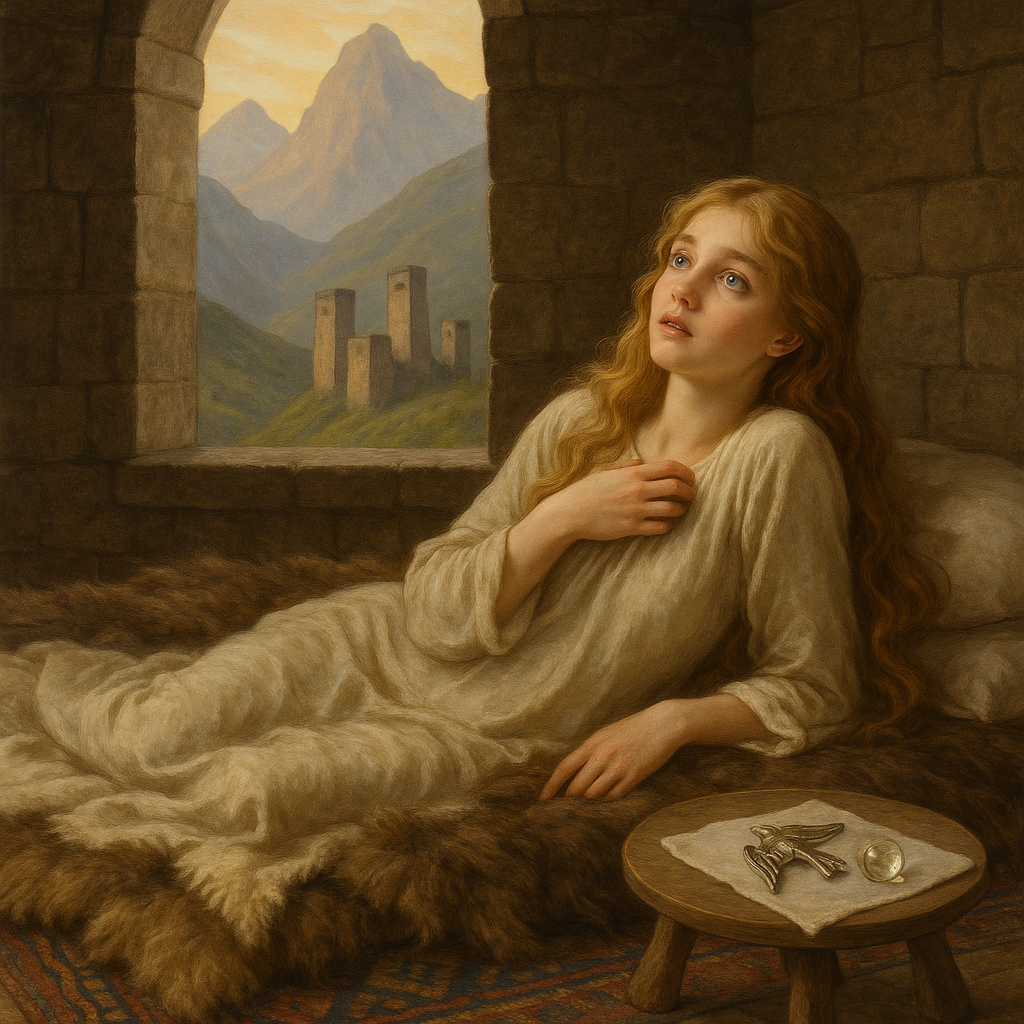 Отложив вышивку, я встала, подошла к окну и вдохнула свежий вечерний воздух, глядя на тёмные силуэты гор... Меня тихо осенила идея: а ведь я могу подарить ему что-нибудь на прощание! Что же может пригодиться ему в дороге?.. Например, мазь для лечения ран — всегда полезно, особенно для воина, как он... Мысли мои витали уже далеко, над горными тропами, по которым скоро отправится Тариэл… любимый Тариэл… Я старалась убедить себя, что делаю это лишь по адату, из попечения о госте и страннике; но сердце знало правду. Я уже тогда любила его, любовь эта и была моим тайным преступлением, сладким и горьким одновременно.
