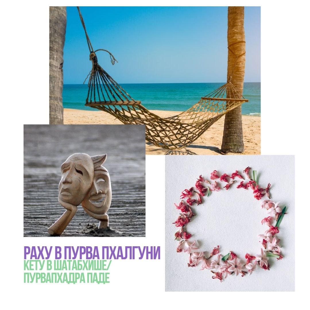 Раху в Пурва Пхалгуни & Кету: Шатабхиша или Пурва Бхадра Когда Раху в Пурва Пхалгуни (13°20'-26°40' Льва), Кету — в Шатабхише (13°20'-20°00' Водолея) или Пурва Бхадре (20°00'-26°40' Водолея). Пхалгуни = "плоды поступков" — накшатра кармических даров! 🍇 😌 Раху в Пурва Пхалгуни: Роскошь и Выбор Управляемая Венерой (лучшим другом Раху!), эта накшатра исполняет материальные желания: Божество — Бхага, бог удачи, дарующий богатство, комфорт и процветание за благие дела прошлого. ☀️ Двойной путь: - Наслаждаться всеми земными радостями. - Искать "истинные" удовольствия. Осторожно! Венера поддерживает любой выбор Раху, даже "скользкий путь". Неблагодарность за дары ведёт к депрессии. Связь с детьми/творчеством — это "плоды ума". 💢 Конфликт: Пурва Пхалгуни vs Шатабхиша Шатабхиша ("Сто Целителей" или "Сто Демонов") — накшатра исцеления ран прошлого. Кету здесь помнит: Жестокую борьбу с внутренними "демонами" (эго). Жертвы, оплаченные высокой кармической ценой. Искусство исцеления других (о