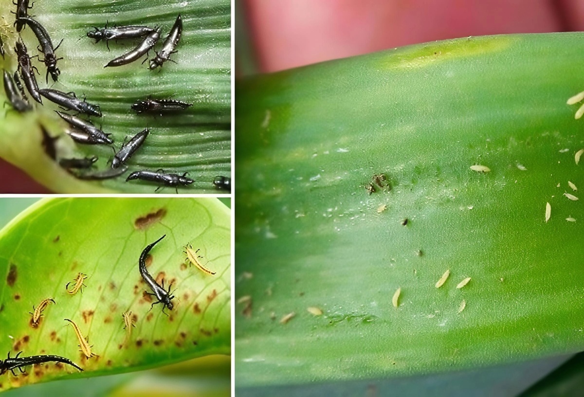2. Скрытный образ жизни: Трипсы предпочитают нижнюю сторону листьев, бутоны, цветочные чашелистики, пазухи – места, куда сложно добраться при опрыскивании. Их крошечный размер позволяет долго оставаться незамеченными.