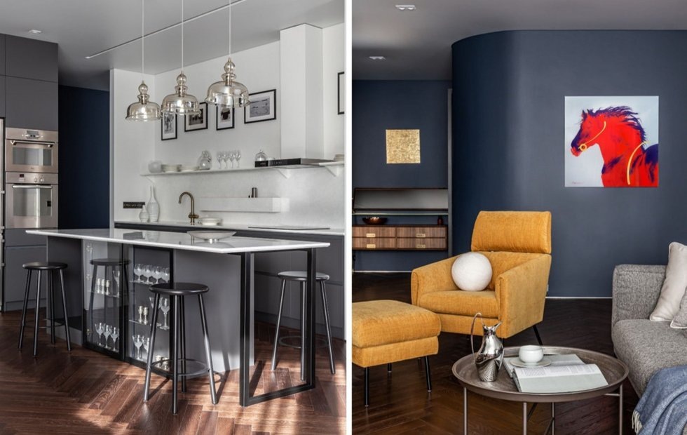 Стильный интерьер, который отражает любовь хозяев к искусству, антиквариату и синему цвету Место: Москва Тип дома: Монолитно-кирпичный Метраж: 158 кв. м Год реализации: 2021 Комнаты: 4 Cанузлы: 2 Бюджет: 15 млн рублей Дизайн: Анастасия Федоровская Стилист: Ольга Антонова Фото: Женя Муравьева Дизайнер Анастасия Федоровская из студии ANFEDO создала уютный и уникальный интерьер в доме на Зоологической улице в Москве. Заказчиками выступила семейная пара с подростком-сыном. Супруги работают в креативной индустрии и испытывают любовь к предметам с историей. Они обратились к дизайнеру по рекомендации, осознав, что не могут завершить проект самостоятельно. Квартира была уже с возведенными перегородками. Несмотря на сложную геометрию комнат, планировку «перекраивать» не стали. Здесь есть мастер-спальня, кухня-гостиная, комната подростка, два санузла и комната для гостей. Согласно пожеланиям заказчиков была выбрана темная и насыщенная палитра. Для оформления стен использована английская краска с