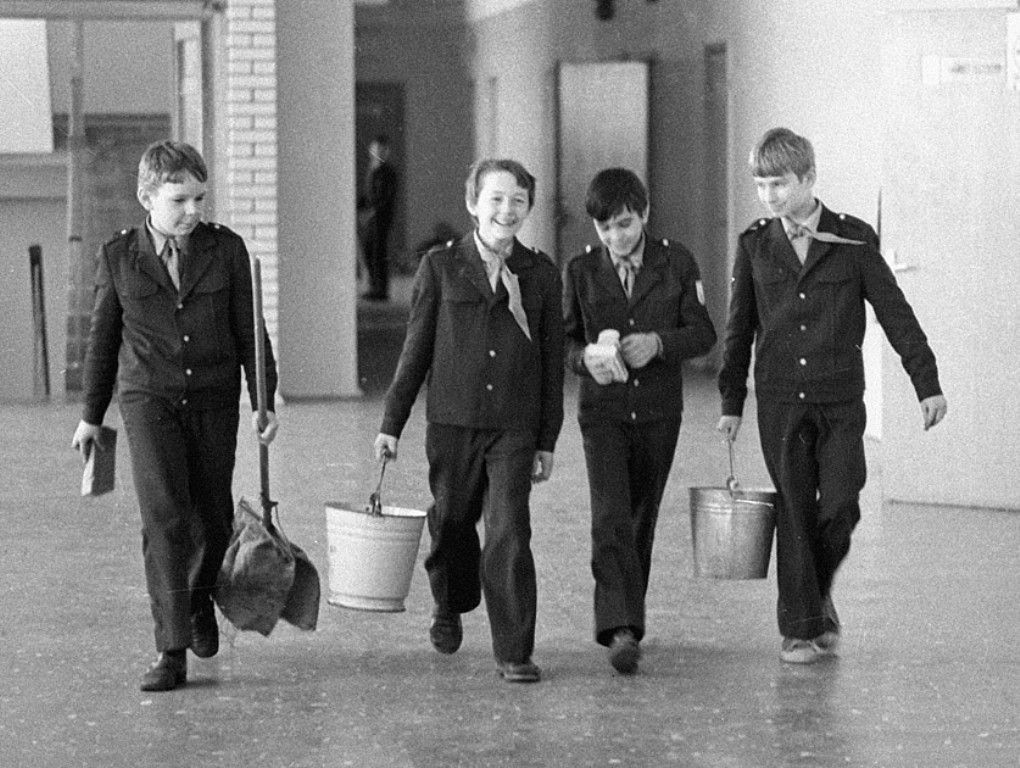 В ноябре, в фойе школы, весь наш класс торжественно принимают в пионеры. Делается это под вынос школьного знамени, звуки горна и грохот барабана. При этом хором даем торжественную, выученную накануне присягу, после чего всем повязываются красные галстуки.