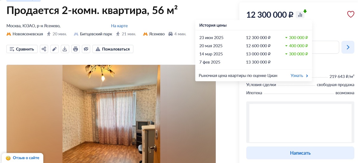 Традиционно по понедельникам делаю обзор “дна” рынка в ЮЗАО. Сегодня посмотрю что происходит с 2к квартирами. По моим наблюдениям это самое интересное. Однушки, как правило, все дорогие, уходят медленно, с “двушками” картина другая. Условия прежние: Внутри МКАД, не первый этаж, дома от 9 этажей, разумная доступность до метро. Похожие обзоры, по конкурентам, только более детальные, я делаю для клиентов когда продаю их квартиры. Всегда нужно быть в курсе, кто продается рядом и держать руку на пульсе :) Не поленился, выяснил. Как всегда объяснение в документах - квартира в долевой собственности и вторая ее половина была куплена 2 года назад у соседки. В первом приближении ничего страшного не вижу, но комбо и места и не всем понятных документов видимо затрудняют продажу. Думаю по такой цене квартира должна уйти - 220 к за м2 это не дорого, если нет других подводных камней. Рядом, в проезде Карамзина, продается похожая квартира по похожей цене. Она в залоге у банка под потребкредит, поэтому